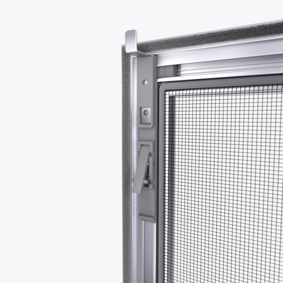 Der Spannrahmen Vario wird durch die Fensteröffnung oben über die Einhängewinkel am positioniert und nach oben gedrückt. Mit den unteren Einhängewinkeln am Fensterrahmen einhängen und verriegeln – fertig.